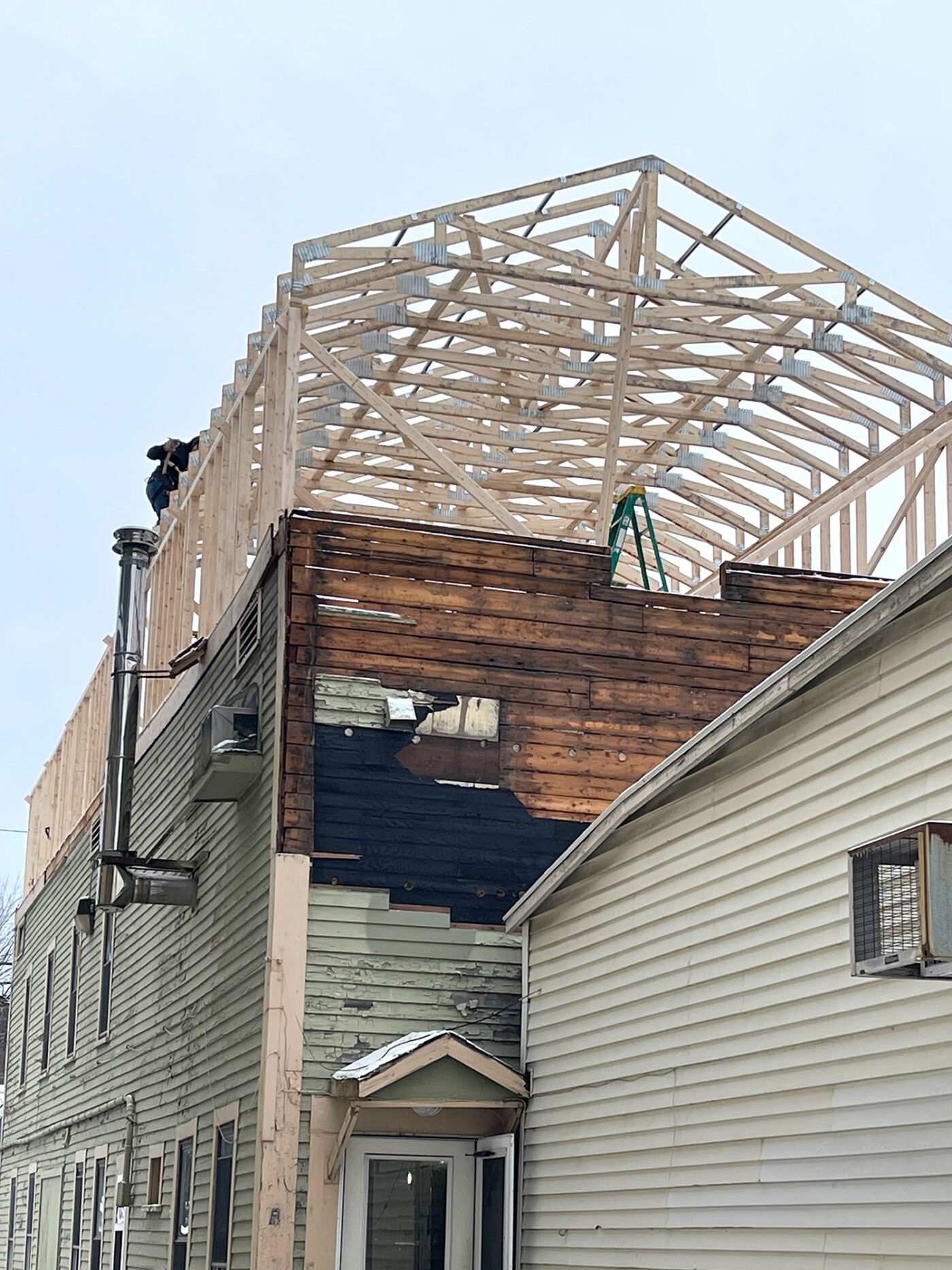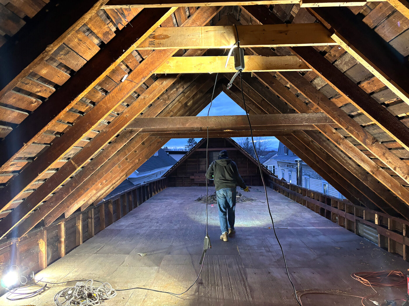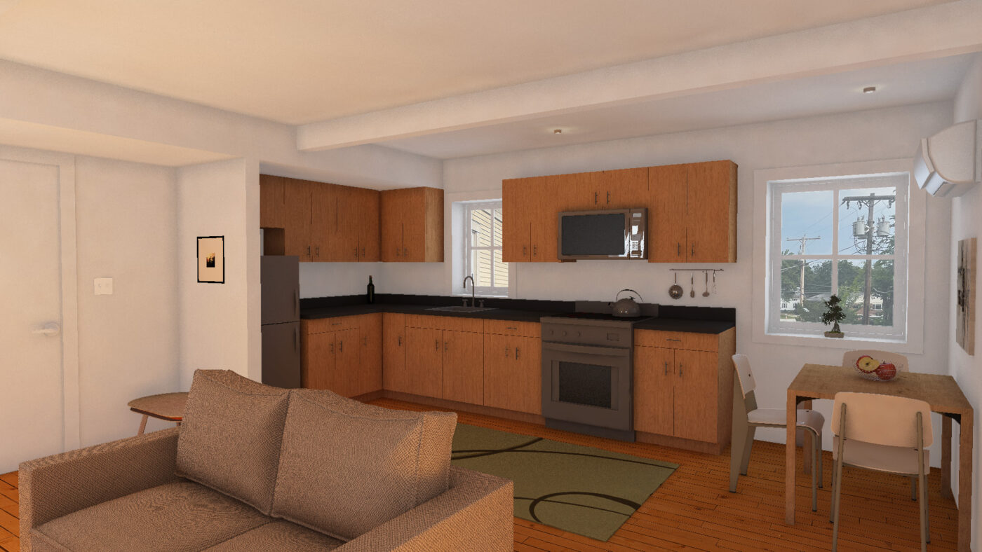 Garland Mill has always wanted to do an affordable housing project using the building science and renewable all electric protocols we use for our regular clients. In the spring of 2023 we had the opportunity to purchase an old building just off Main Street in Lancaster and we jumped on it. The building in question was the longtime headquarters of the beloved local newspaper the Coos County Democrat. We cleaned out the building and spent a year and a half working on financing, planning and designing for the project. An early coordination meeting with the Town of Lancaster revealed that the area was lacking in affordable one bedroom apartments. So we put our focus there. Demolition began in December of 2024 and we plan to welcome new tenants in March of 2026. The building will be an all electric net zero building. Warm in the winter, cool in the summer, excellent IAQ. Here are some renderings and process pictures of the initial work.